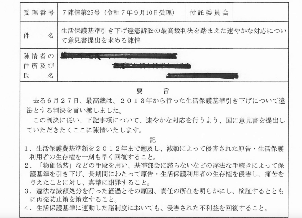 区民より、生活保護の基準引き下げ訴訟、いわゆる「いのちのとりで訴訟」に関する重要な「陳情」があがりました。